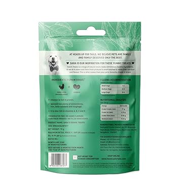 Heads Up For Tails Sara’s Chicken Jerky with Spinach delivers a natural, protein rich treat made from farm fresh chicken breast and nutrient dense spinach. The recipe uses slow cooking to preserve flavor and nutrients while creating a chewy texture dogs enjoy. This treat supports muscle strength, digestion, and immune health through high quality protein, iron, fiber, and antioxidants.