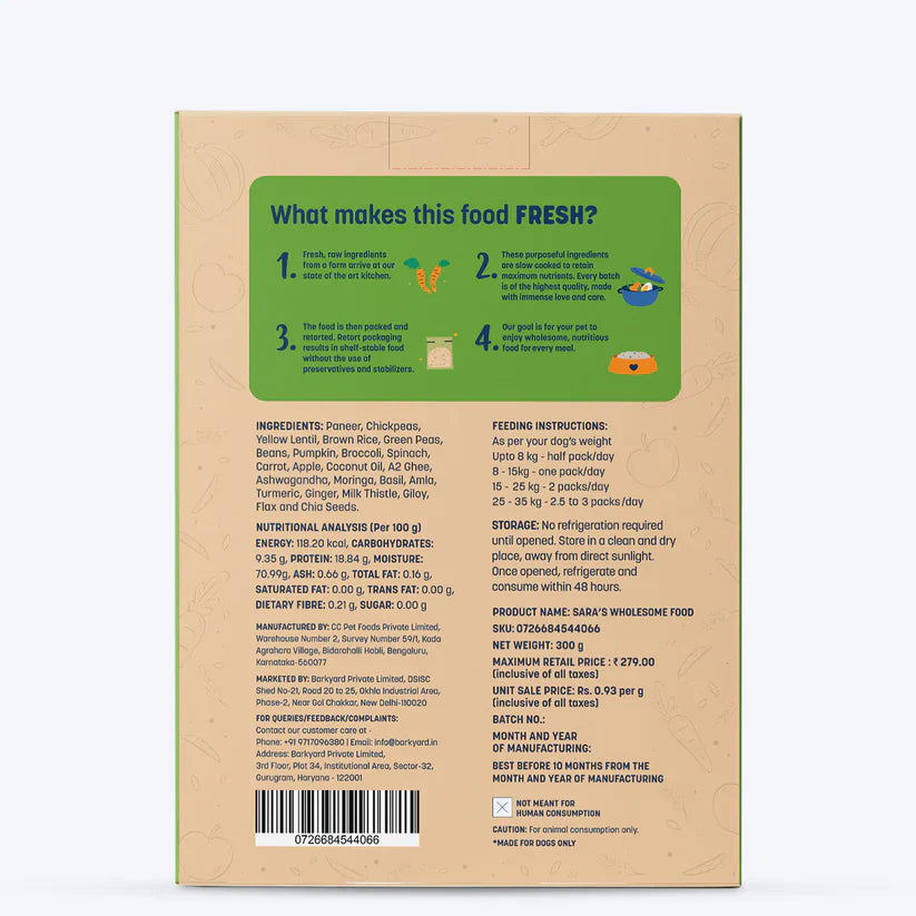 Key Features • Made with real paneer and fresh vegetables for balanced nutrition • Rich in protein and calcium to support muscle and bone health • Contains fiber, vitamins, and antioxidants for healthy digestion and immunity • 100% human-grade ingredients, cooked gently to retain flavor and nutrients • Free from artificial preservatives, flavors, and fillers • Suitable for puppies and adult dogs of all breeds • Vegetarian formula, ideal for sensitive or meat-free dietsFree Standard Shipping with any online purchase of Rs. 1000 (merchandise subtotal excludes store pick up items; merchandise subtotal is calculated before sales tax, before gift wrap charges, and after any discounts or coupons). Truck delivery and shipping surcharges on over-sized or extremely heavy items will still apply (these charges are indicated on the appropriate product information pages and will be displayed in the shipping subtotal of your order). Orders typically arrive within 3-6 business days. Items shipped directly from the vendor or to Alaska and Hawaii have longer delivery lead times. This offer does not apply to Alaska, Hawaii, Puerto Rico or Business Direct orders.