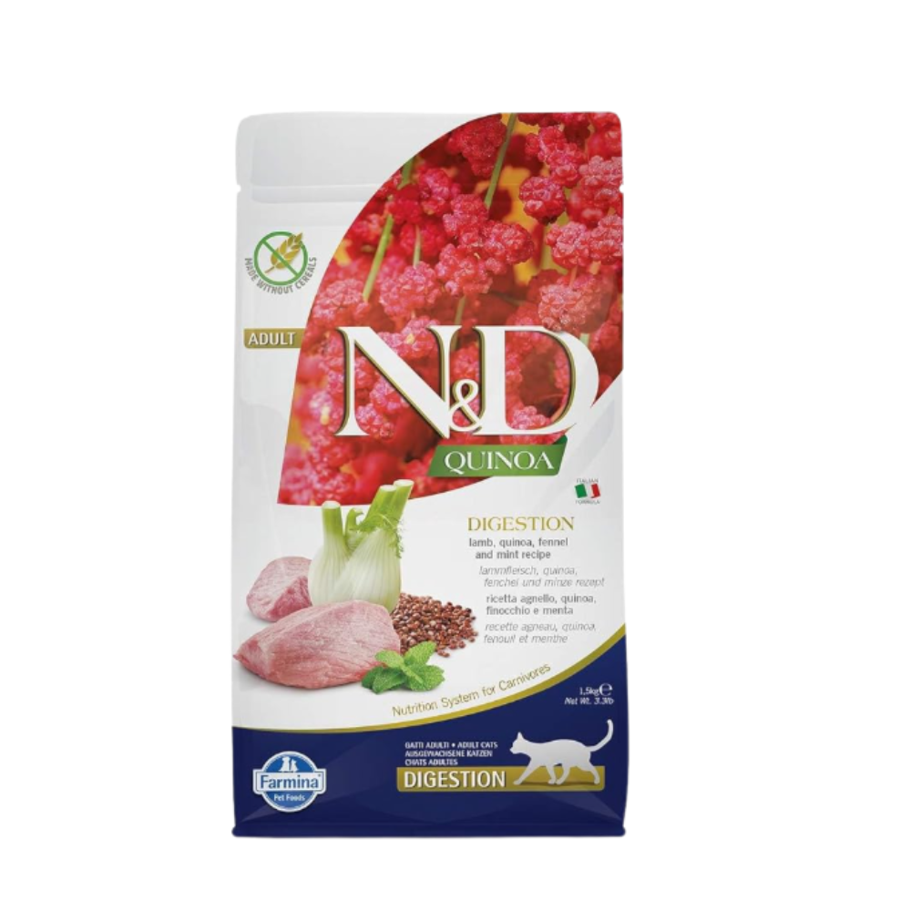 N&D Quinoa Digestion Lamb Adult Dry Cat Food offers complete and balanced nutrition for adult cats with sensitive digestion. It is specially crafted to support cats experiencing maldigestion or exocrine pancreatic insufficiency. With 92% protein from animal origin, this grain-free formula provides high digestibility and optimal nourishment.
